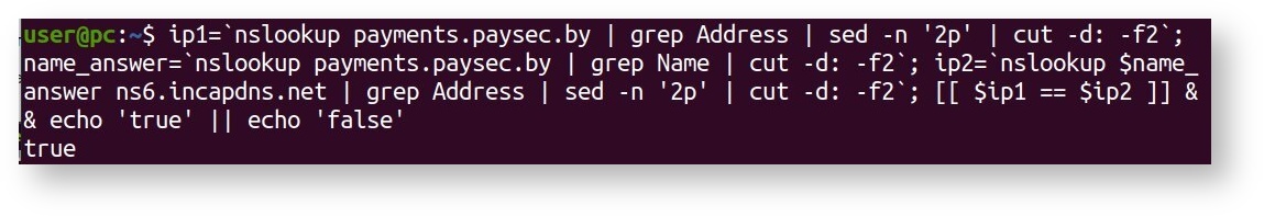 ip1=`nslookup payments.paysec.by | grep Address | sed -n '2p' | cut -d: -f2`; name_answer=`nslookup payments.paysec.by | grep Name | cut -d: -f2`; ip2=`nslookup $name_answer ns6.incapdns.net | grep Address | sed -n '2p' | cut -d: -f2`; [[ $ip1 == $ip2 ]] && echo 'true' || echo 'false'