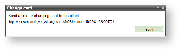 The card replacement for subsequent payments by subscription (recurrent payments) can be initiated from the personal account in case when the card that was used in that subscription is expiring or has already expired. When you select "Change card" option from the context menu then new window is opened with a proposal to send the reference for card replacement to the payer.