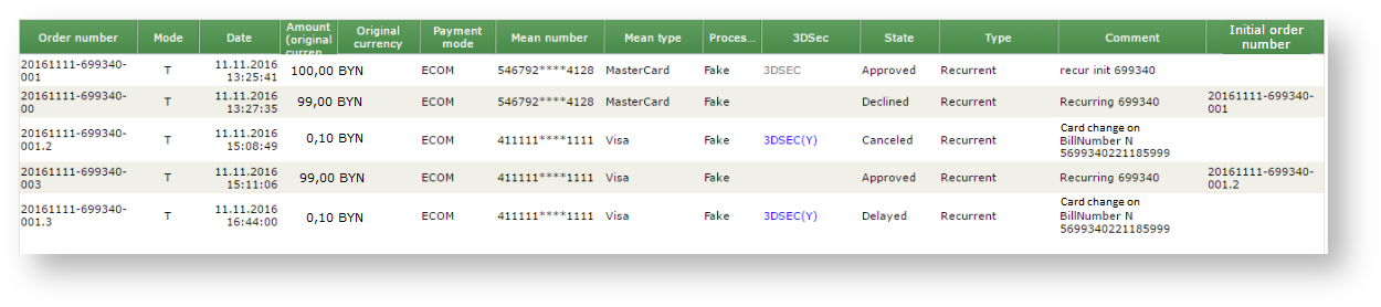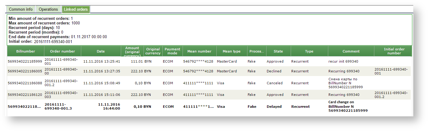 The information about blocked amount is displayed also in the tab ’Related orders’ of order details dialog for any payment of this subscribe. The "Comment" field shows the cause of the blocking payment.