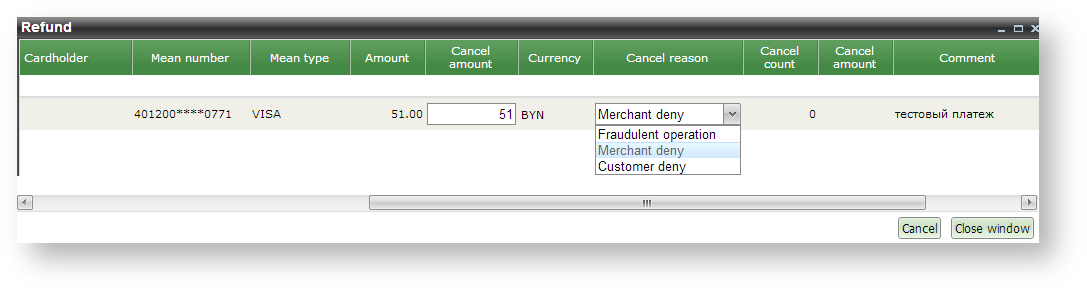 Column  'Cancel amount'  contains (by default) the full authorization amount. It can be changed (decreased) in case when a partial cancellation is required (for example the customer decided to return a part of the ordered items). The ' Reason ' field should be set according to reason of cancellation. By default it is set to  'Customer deny'  value.