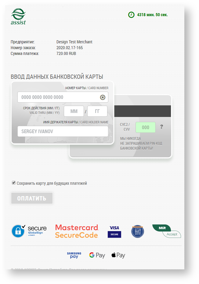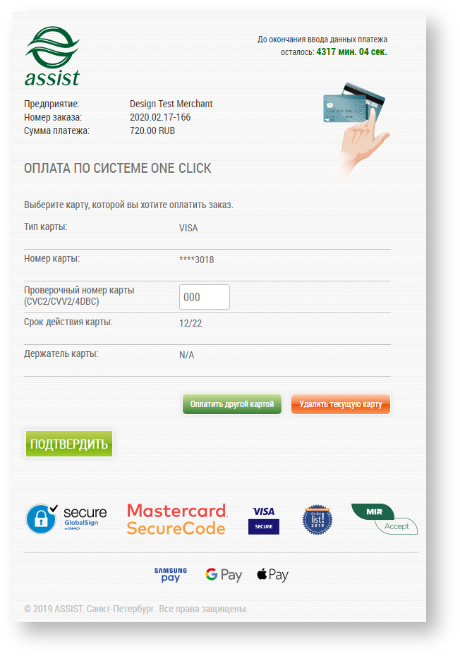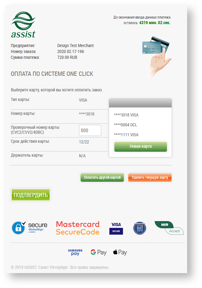 Если клиент соглашается использовать одну из сохраненных ранее карт для оплаты, то при совершении платежа ему предлагается ввести лишь ее код CVC2.