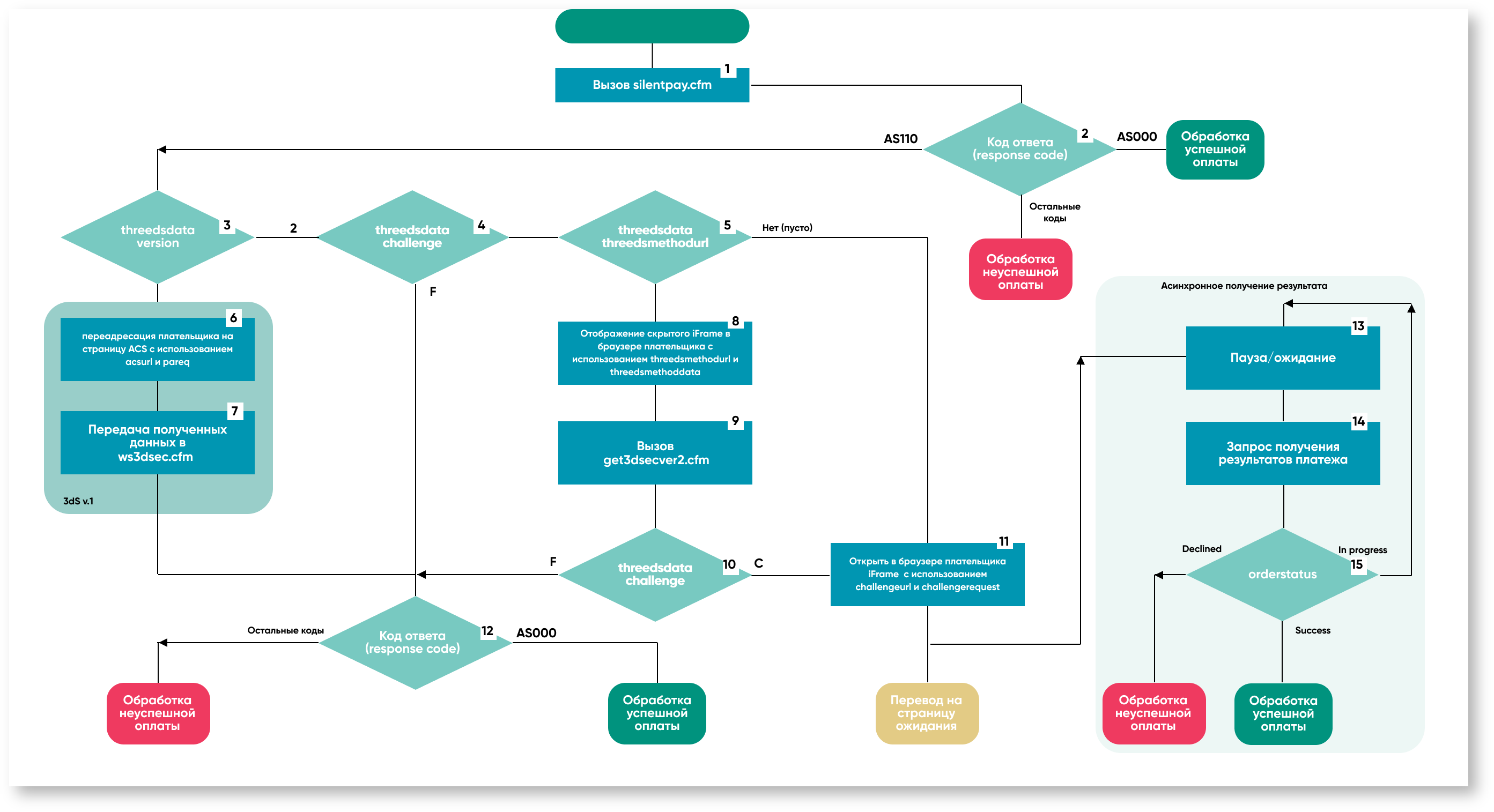 Результат этой проверки АПК Ассист получит на свой сервер в асинхронном режиме (блоки 13, 14). В зависимости от результата аутентификации и настроек процессинга и предприятия (блок 15), АПК Ассист проведет транзакцию оплаты в процессинге или закроет операцию с ошибкой.