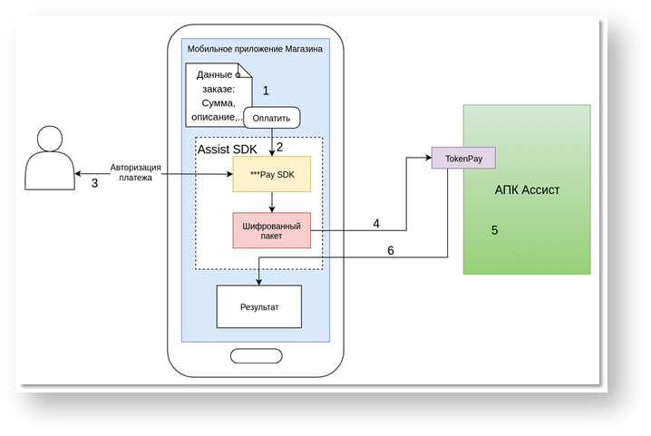 4. Зашифрованный пакет с данными платежа и токеном передается в сервис оплаты TokenPay на стороне АПК Ассист .