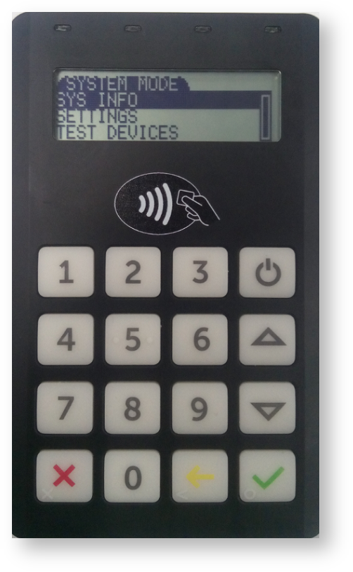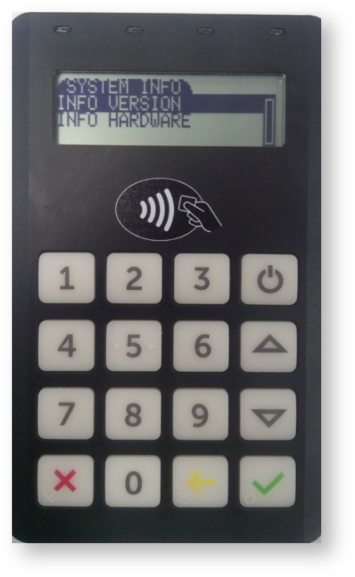 Далее следует выбрать пункт меню «SYS INFO» с помощью кнопок со стрелками вверх-вниз. Выбор пункта меню следует подтвердить нажатием кнопки «ОК» с зеленой галочкой.