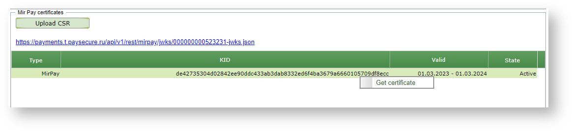 After loading the request, a certificate line is created in the table with the status "Active" and its validity period. Above the table is a link to a pre-made JSON Web Key Set (JWKS) with this certificate. The certificate can also be downloaded separately, using the context menu.