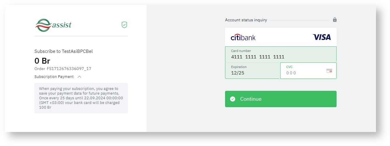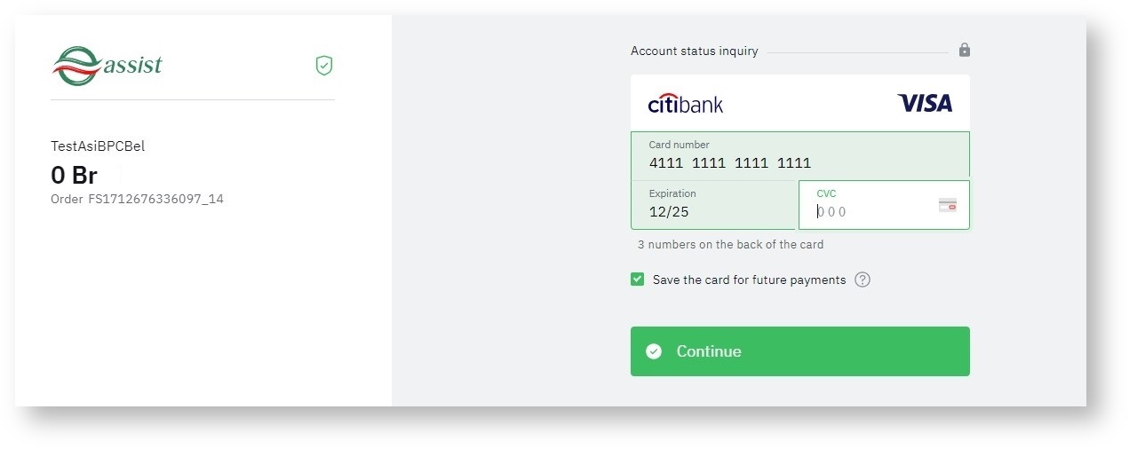 When performing an ASI operation, the payment page will display the Account status inquiry heading, a zero payment amount, and a Continue button instead of the Pay button for the customer.
