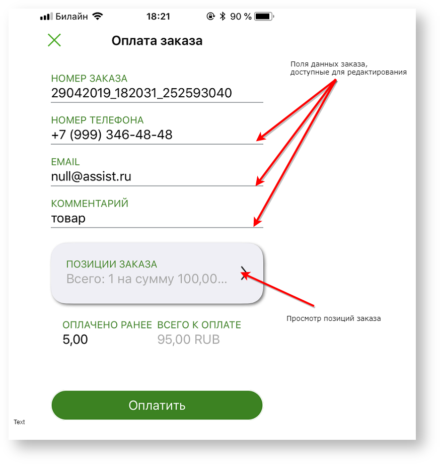 Если номер заказа введен правильно, то полученные от информационной системы компании-продавца или курьерской службы данные заказа - Email адрес покупателя, его телефон и список оплачиваемых товаров отобразятся на экране приложения:
