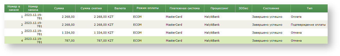 Во вкладке «Операции» можно увидеть все операции по данному заказу. В примере ниже имеются четыре операции – оплата, подтверждение и две частичные отмены.