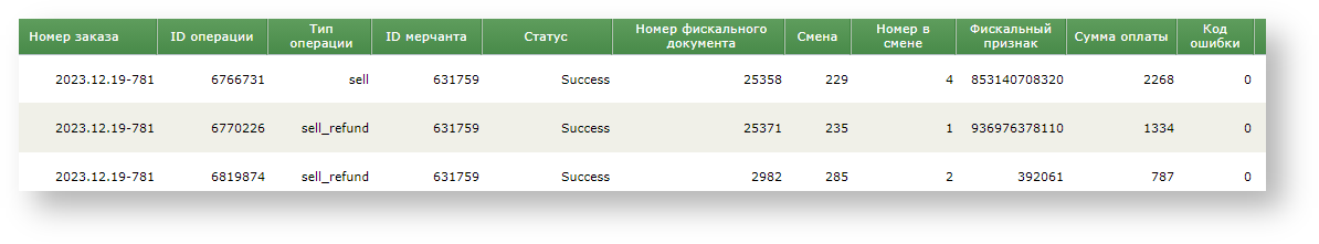 После нажатия кнопки «Отменить заказы» в колонках «Кол-во возвратов» и «Сумма возвратов» отображается кол-во возвратов и общая сумма по ним, а в колонке «Результат» отображается результат для каждого заказа, по которому производился возврат денежных средств. В случае неуспеха отображается соответствующая ошибка. Если в результате технического сбоя транзакция была завершена неуспешно, можно повторить отмену еще раз.