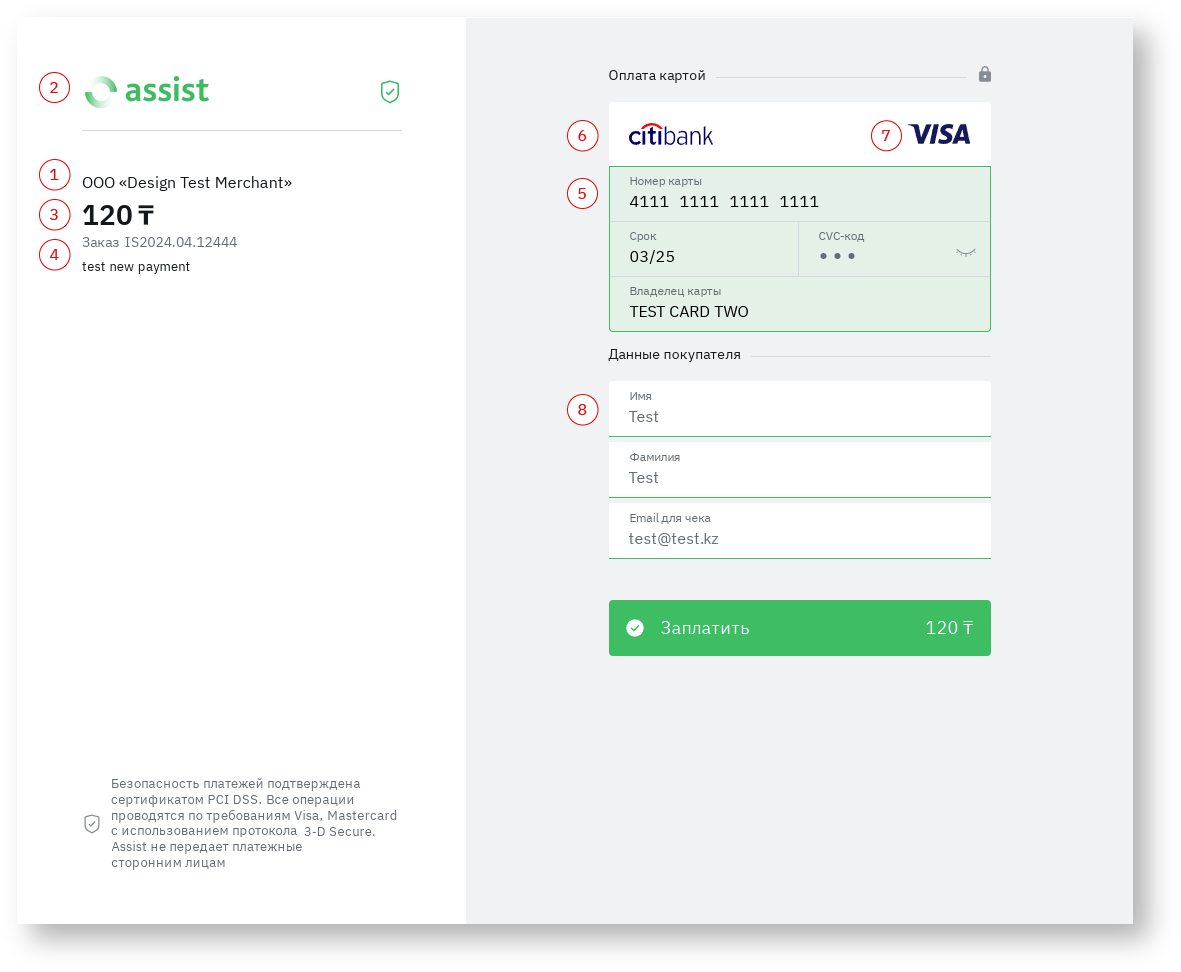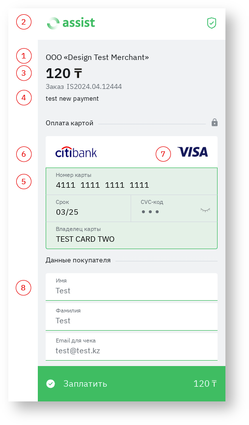 На нижеследующих изображениях красными цифрами обозначены элементы платежной страницы.