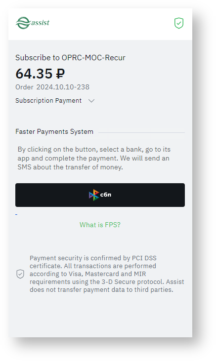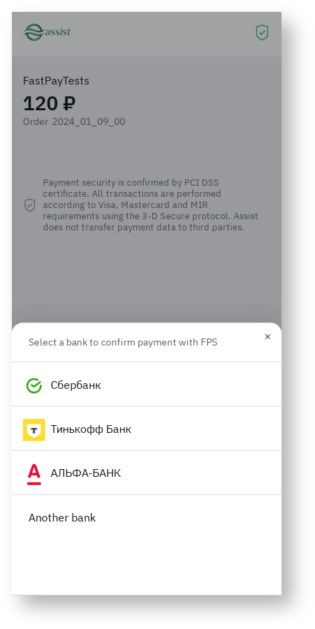 When a customer uses mobile payment pages, then a list of banks is displayed to select payment via FPS (instead of a QR code); after selecting a bank, an automatic transition to the application of this bank on the customer’s smartphone is carried out. - Assist receives a notification of payment from a partner bank.