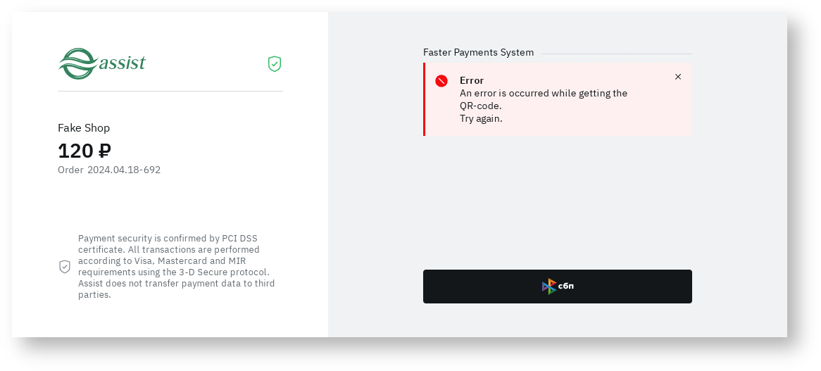 - If for some reason it was not possible to generate a QR code, then a corresponding message appears with a suggestion to try again.