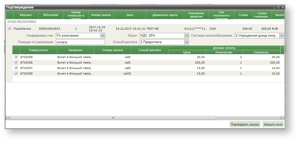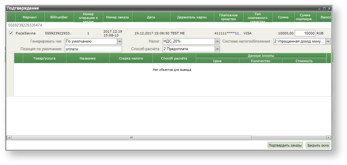 - Фискализация выполняется на этапе авторизации заказа. Все параметры фискализации должны быть переданы предприятием при оплате заказа. Если параметры не переданы, то они устанавливаются по умолчанию согласно настройкам предприятия. В окне подтверждения параметры фискализации недоступны для редактирования.