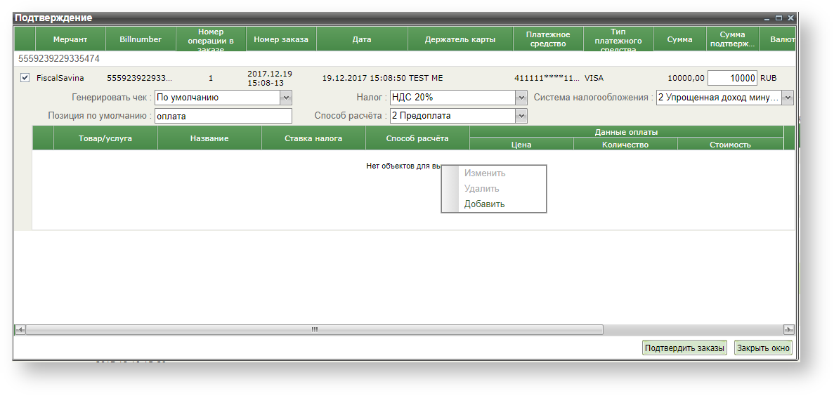 Если предприятие использует двухстадийный механизм работы, то после завершения авторизации по карте и блокирования средств на счету клиента, предприятию необходимо в течение 4 дней провести финансовую транзакцию для подтверждения снятия денег со счета. Пользователь предприятия может совершить данную операцию, выбрав в контекстном меню заказа пункт «Подтверждение».