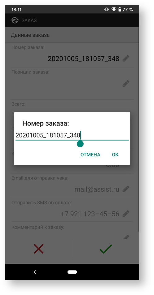 Нажатие кнопки «Отклонить» позволяет задать номер заказа только вручную.