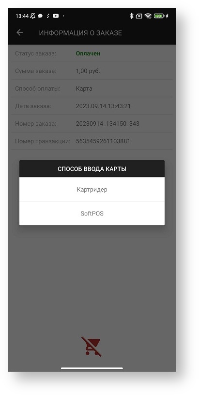 Если заказ был оплачен картой, то для подтверждения отмены покупателю предлагается вставить карту в беспроводной терминал (терминал принимает данные карты с помощью одного из возможных способов - NFC, чип, магнитная полоса):
