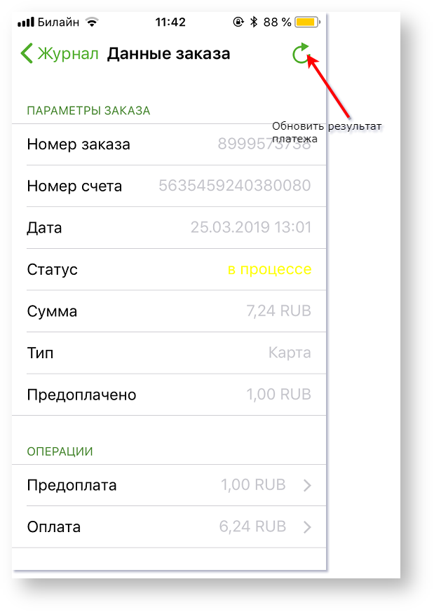 Если проведенный платеж имеет статус «В процессе», можно повторно запросить результат платежа: