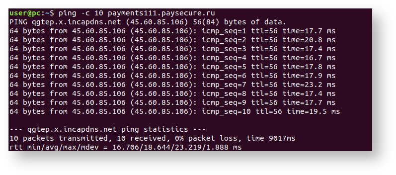 Для проверки целостности и качества соединения с сервером payments111.paysecure.ru используется команда в терминале: