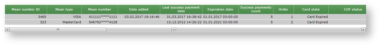 Clicking on the black triangle at the beginning of the line with the customer record allows you to open an additional window. Here you can see the data on all the saved cards of this customer in a table with the following columns.