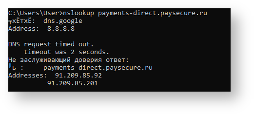 Для диагностики службы DNS, проверки DNS записей сервера payments-direct.paysecure.ru и обнаружения проблем, связанных с разрешением имен в системе DNS используется команда в командной строке (cmd):